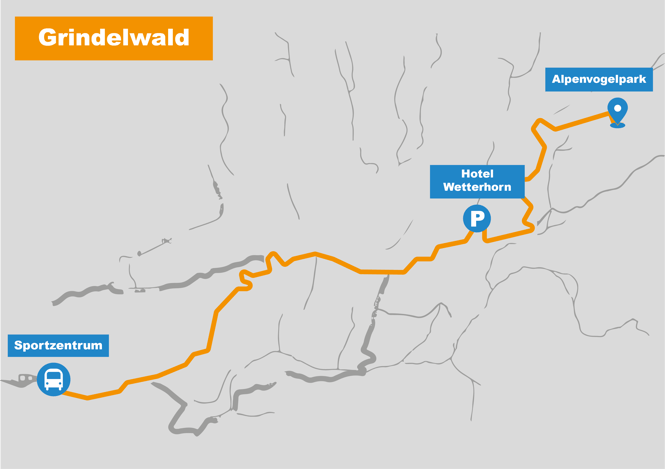 "Ischbodenhütte". Zu Fuss ist der Alpenvogelpark vom Restaurant Wetterhorn in 45 min über die Bergstrasse erreichbar. Die Strasse ist für Autofahrten nur mit Bewilligung befahrbar.